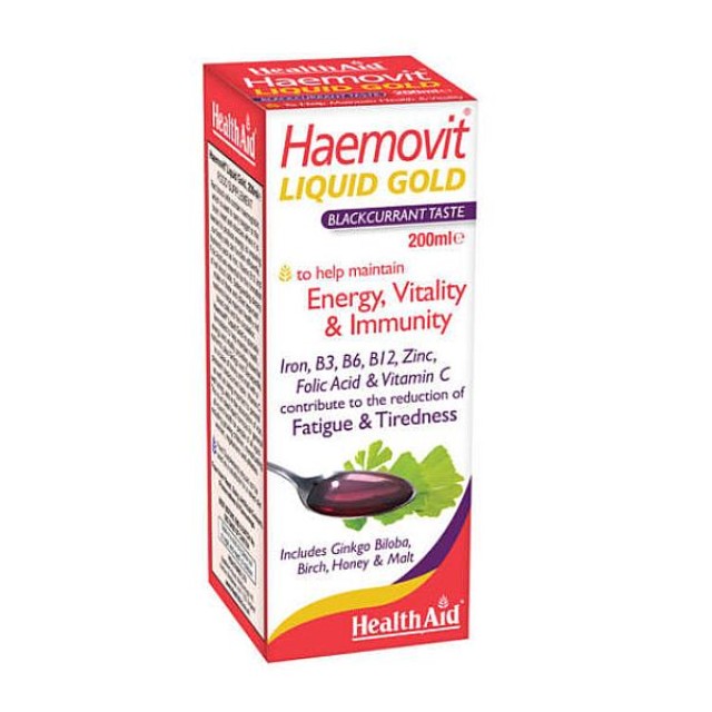 Το Haemovit GOLD Liquid* της HealthAid, είναι σιρόπι με 21 συστατικά, μεταξύ των οποίων, βιταμίνες του συμπλέγματος Β, C, μέταλλα όπως σίδηρο (14mg/10ml) και ψευδάργυρο, ηλεκτρολύτες, εκχύλισμα βύνης, η οποία αποτελεί πλούσια πηγή πρωτεϊνών και φυτικά εκχυλίσματα από Ginkgo Biloba, Sarsaparilla & Birch, , για την διατροφική υποστήριξη του οργανισμού στην αύξηση επιπέδων ενέργειας και στην τόνωση σε σώμα και πνεύμα. Κατάλληλο για όσους εμφανίζουν χαμηλά επίπεδα σιδήρου, για όλες τις ηλικίες, γυναίκες (ιδιαίτερα κατά την περίοδο της έμμηνου ρύσης), αθλητές, φυτοφάγους, καπνιστές κ.α.. Χρήσιμο ως εναλλακτική πολυβιταμίνη σε υγρή μορφή και για όσους δεν μπορούν να καταπιούν ταμπλέτες.