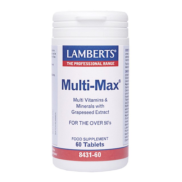 Η Multi-Max® αποτελεί μια υψηλής περιεκτικότητας πολυβιταμινούχο φόρμουλα που συνιστάται για άτομα άνω των 50 ετών. Το προϊόν αυτό περιέχει υψηλά επίπεδα του συνόλου των βιταμινών B μαζί με ένα ολοκληρωμένο συνδυασμό των σημαντικότερων μετάλλων, σε ποσότητες επαρκείς για την υποστήριξη ακόμη και τη χειρότερης δυνατής δίαιτας. Εκτός του υψηλού επιπέδου των βιταμινών Β, ιδιαίτερη έμφαση δόθηκε στις βιταμίνες Α , Ε, C και στον ψευδάργυρο καθώς αυτά τα μικροθρεπτικά συστατικά συμβάλλουν στη φυσιολογική λειτουργία του ανοσοποιητικού συστήματος. Σε περιπτώσεις που απαιτείται περαιτέρω αύξηση της διατροφικής πρόσληψης ασβεστίου και μαγνησίου, το Multi-Max® μπορεί να συγχορηγηθεί με το Osteoguard®. Η Multi-Max® αποτελεί κλινικά ελεγμένο σκεύασμα καθώς με αυτό έχει διεξαχθεί διπλή τυφλή τυχαιοποιημένη ,ελεγχόμενη με εικονικό φάρμακο, μελέτη για την αξιολόγηση της επίδρασης χορήγησης αντιοξειδωτικών σε πάσχοντες από ιδιοπαθείς εμβοές. Η Multi-Max, όπως όλα τα σκευάσματα της Lamberts, παρασκευάζεται εντός του Ηνωμένου Βασιλείου σύμφωνα με τα αυστηρά πρότυπα της Φαρμακευτικής GMP (Pharmaceutical GMP).