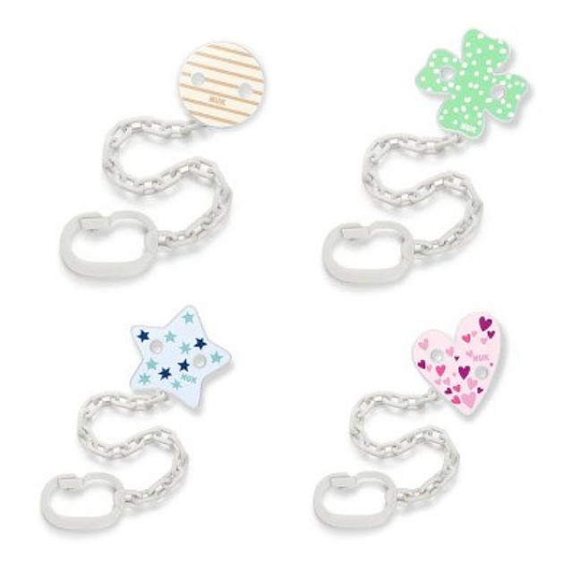 Σίγουρα γνωρίζετε πόσο πολύ αγαπάει το μωρό σας την πιπίλα του και θέλει να την έχει πάντα μαζί του. Οι αλυσίδες και κορδέλες πιπίλας αποτελούν την ιδανική λύση προκειμένου να παραμένει η πιπίλα στη θέση που πρέπει και να μην πέφτει στο έδαφος ή να χάνεται. Η αλυσίδα πιπίλας NUK διαθέτει πρακτικό σύστημα κλιπ, με το οποίο κρεμιέται πολύ εύκολα στα ρούχα του μωρού σας. Το σύστημα άγκιστρου διευκολύνει επιπλέον τη στερέωση της πιπίλας στην αλυσίδα.