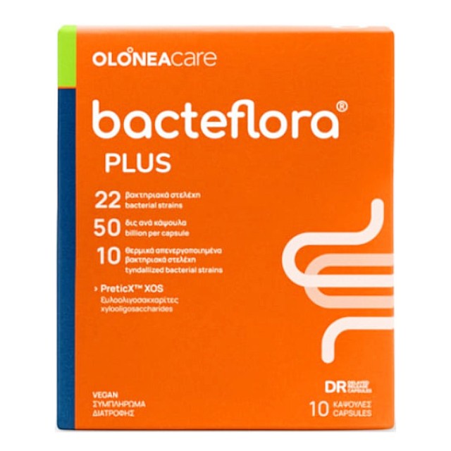 Το bacteflora PLUS περιέχει 22 στελέχη προβιοτικών, 50δις ανά κάψουλα, πρεβιοτικά ξυλοολιγοσακχαρίτες PreticX™ και 10 μεταβιοτικά στελέχη. Το εντερικό μικροβίωμα καθημερινά διαταράσσεται από πολλούς παράγοντες και επηρεάζεται άμεσα από την ένταση και την πίεση της καθημερινότητας. Ο πιο συνηθισμένος λόγος λήψης προβιοτικών είναι οι αντιβιώσεις ή άλλες φαρμακευτικές αγωγές, που μπορεί να διαταράξουν το εντερικό μικροβίωμα, προκαλώντας συμπτώματα όπως η διάρροια, δερματικά εξανθήματα, μυκητιάσεις ή στοματίτιδα. Το κάπνισμα ή/και η υπερκατανάλωση αλκοόλ επηρεάζουν, επίσης, την ισορροπία των ωφέλιμων μικροοργανισμών του εντέρου. Η υπερκατανάλωση ζωικών προϊόντων, ζάχαρης και επεξεργασμένων τροφών με την ταυτόχρονη μειωμένη λήψη φυτικών ινών, διαταράσσουν, επίσης, το εντερικό μικροβίωμα. Η διατροφή επηρεάζει και έμμεσα το μικροβίωμα του εντέρου και την ομαλή λειτουργία του, μέσω της ποσότητας αντιβιοτικών και φυτοφαρμάκων, τα οποία φτάνουν στον οργανισμό από τρόφιμα ζωικής και φυτικής προέλευσης αντίστοιχα. Ενώ και η ποσότητα χλωρίου στο νερό δρα αρνητικά για τη μικροχλωρίδα του εντέρου. Μεγάλη είναι και η σημασία της περιβαλλοντικής μόλυνσης και πως αυτή επηρεάζει όλους τους τομείς της υγείας, συμπεριλαμβανομένης της ισορροπίας του εντερικού μικροβιώματος. Η απαιτητική καθημερινότητα και ψυχολογική επιβάρυνση σε συνδυασμό με την πάροδο της ηλικίας είναι από τους πιο καθοριστικούς παράγοντες διατάραξης του εντερικού μικροβιώματος και έξαρσης συμπτωμάτων του γαστρεντερικού όπως το φούσκωμα, τα αέρια και ο κοιλιακός πόνος, τα οποία σχετίζονται και με το Σύνδρομο Ευερέθιστου Εντέρου. Σε απαιτητικές περιόδους με έντονο στρες και υψηλές ανάγκες η ενισχυμένη συμπλήρωση με προβιοτικά για την εξισορρόπηση του εντερικού μικροβιώματος και την ομαλή λειτουργία του εντέρου είναι απαραίτητη σε καθημερινή βάση. Είναι σχεδιασμένο για την καθημερινή συμπλήρωση και ενίσχυση του εντερικού μικροβιώματος και την αντιμετώπιση γαστρεντερικών διαταραχών, περιόδους λήψης αντιβίωσης, την αντιμετώπιση διάρροιας, την ανακούφιση από τα συμπτώματα του Συνδρόμου Ευερέθιστου Εντέρου (φούσκωμα, αέρια, πόνο), την αντιμετώπιση γαστρεντερικών λοιμώξεων, τη θεραπεία Ελικοβακτηριδίου του Πυλωρού, την αντιμετώπιση στοματίτιδας, την αποφυγή διάρροιας ταξιδιώτη κατά τη διάρκεια ταξιδιού. Δεν περιέχει συντηρητικά, πρόσθετα, ζάχαρη, λακτόζη και γλουτένη και είναι κατάλληλο για vegans και vegetarians.