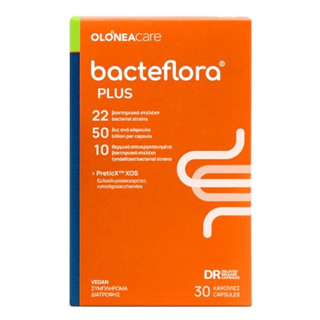 Το bacteflora PLUS περιέχει 22 στελέχη προβιοτικών, 50δις ανά κάψουλα, πρεβιοτικά ξυλοολιγοσακχαρίτες PreticX™ και 10 μεταβιοτικά στελέχη. Το εντερικό μικροβίωμα καθημερινά διαταράσσεται από πολλούς παράγοντες και επηρεάζεται άμεσα από την ένταση και την πίεση της καθημερινότητας. Ο πιο συνηθισμένος λόγος λήψης προβιοτικών είναι οι αντιβιώσεις ή άλλες φαρμακευτικές αγωγές, που μπορεί να διαταράξουν το εντερικό μικροβίωμα, προκαλώντας συμπτώματα όπως η διάρροια, δερματικά εξανθήματα, μυκητιάσεις ή στοματίτιδα. Το κάπνισμα ή/και η υπερκατανάλωση αλκοόλ επηρεάζουν, επίσης, την ισορροπία των ωφέλιμων μικροοργανισμών του εντέρου. Η υπερκατανάλωση ζωικών προϊόντων, ζάχαρης και επεξεργασμένων τροφών με την ταυτόχρονη μειωμένη λήψη φυτικών ινών, διαταράσσουν, επίσης, το εντερικό μικροβίωμα. Η διατροφή επηρεάζει και έμμεσα το μικροβίωμα του εντέρου και την ομαλή λειτουργία του, μέσω της ποσότητας αντιβιοτικών και φυτοφαρμάκων, τα οποία φτάνουν στον οργανισμό από τρόφιμα ζωικής και φυτικής προέλευσης αντίστοιχα. Ενώ και η ποσότητα χλωρίου στο νερό δρα αρνητικά για τη μικροχλωρίδα του εντέρου. Μεγάλη είναι και η σημασία της περιβαλλοντικής μόλυνσης και πως αυτή επηρεάζει όλους τους τομείς της υγείας, συμπεριλαμβανομένης της ισορροπίας του εντερικού μικροβιώματος. Η απαιτητική καθημερινότητα και ψυχολογική επιβάρυνση σε συνδυασμό με την πάροδο της ηλικίας είναι από τους πιο καθοριστικούς παράγοντες διατάραξης του εντερικού μικροβιώματος και έξαρσης συμπτωμάτων του γαστρεντερικού όπως το φούσκωμα, τα αέρια και ο κοιλιακός πόνος, τα οποία σχετίζονται και με το Σύνδρομο Ευερέθιστου Εντέρου. Σε απαιτητικές περιόδους με έντονο στρες και υψηλές ανάγκες η ενισχυμένη συμπλήρωση με προβιοτικά για την εξισορρόπηση του εντερικού μικροβιώματος και την ομαλή λειτουργία του εντέρου είναι απαραίτητη σε καθημερινή βάση. Είναι σχεδιασμένο για την καθημερινή συμπλήρωση και ενίσχυση του εντερικού μικροβιώματος και την αντιμετώπιση γαστρεντερικών διαταραχών, περιόδους λήψης αντιβίωσης, την αντιμετώπιση διάρροιας, την ανακούφιση από τα συμπτώματα του Συνδρόμου Ευερέθιστου Εντέρου (φούσκωμα, αέρια, πόνο), την αντιμετώπιση γαστρεντερικών λοιμώξεων, τη θεραπεία Ελικοβακτηριδίου του Πυλωρού, την αντιμετώπιση στοματίτιδας, την αποφυγή διάρροιας ταξιδιώτη κατά τη διάρκεια ταξιδιού. Δεν περιέχει συντηρητικά, πρόσθετα, ζάχαρη, λακτόζη και γλουτένη και είναι κατάλληλο για vegans και vegetarians.