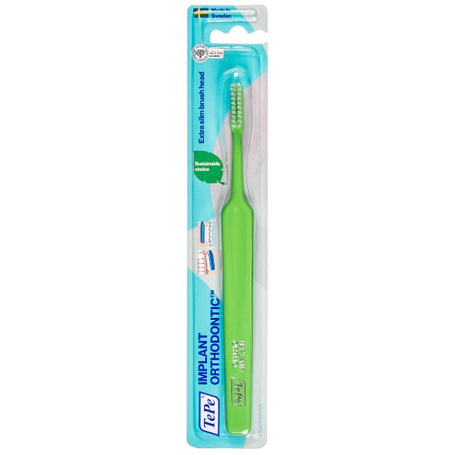 Η οδοντόβουρτσα TePe Implant/Ortho έχει μαλακιές ίνες, μια πολύ στενή κεφαλή και ένα μακρύ, λεπτό αυχένα ώστε να διευκολύνει την πρόσβαση και να καθαρίζει τα εμφυτεύματα και τα ορθοδοντικά μηχανήματα.